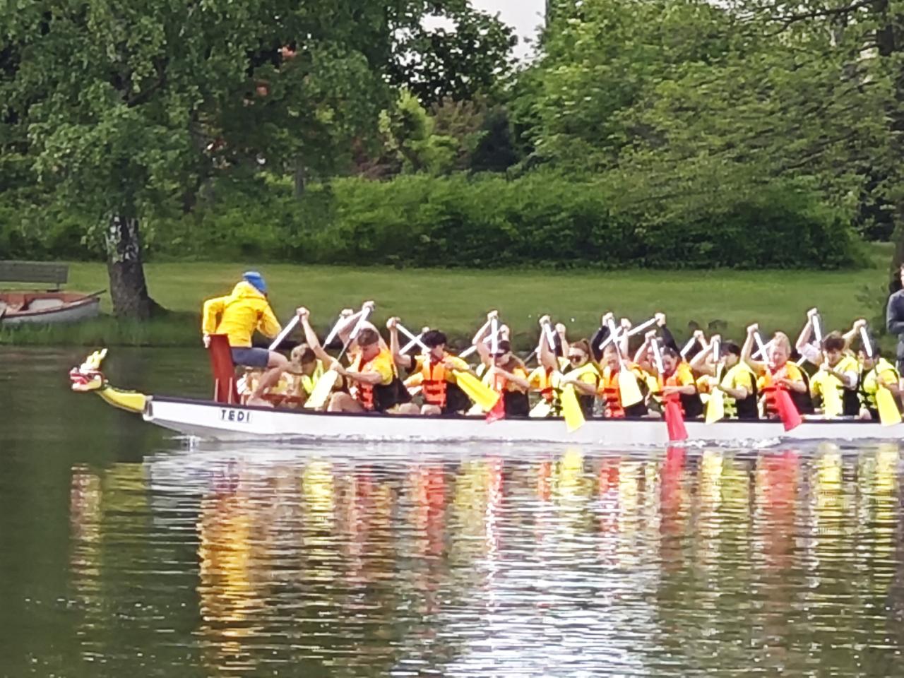 Dvacetičlenné týmy s kormidelníkem a bubeníkem v každé z jízd jely 200 metrů dlouhou trasu v lodí, která je dlouhá 14,5 metru.