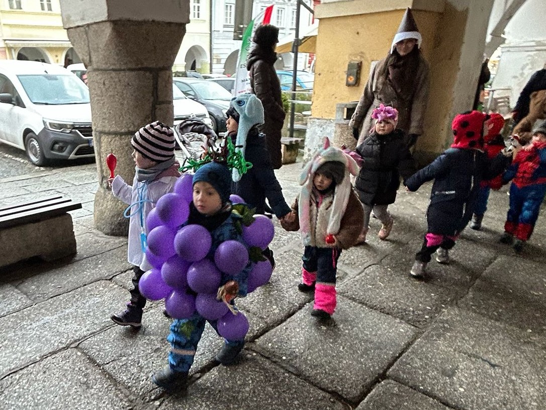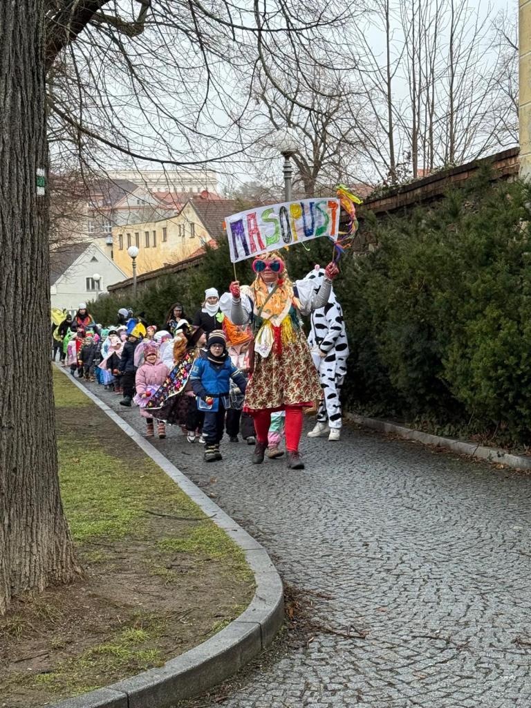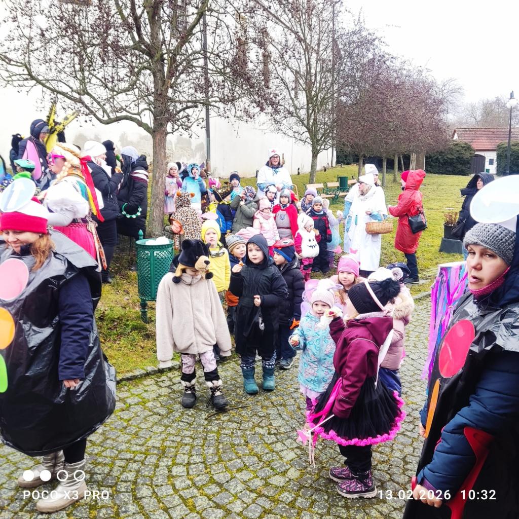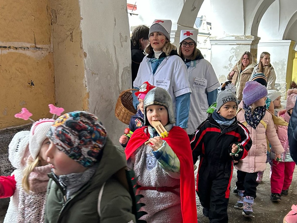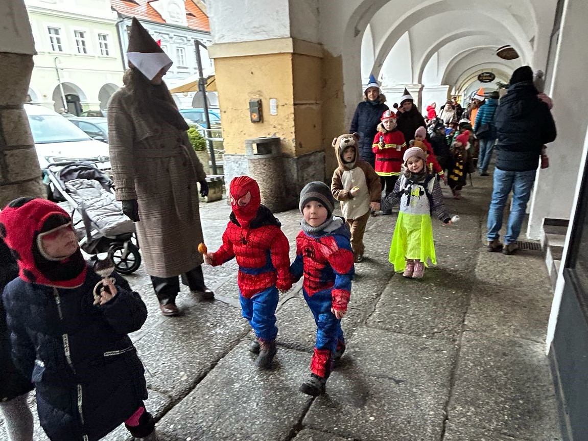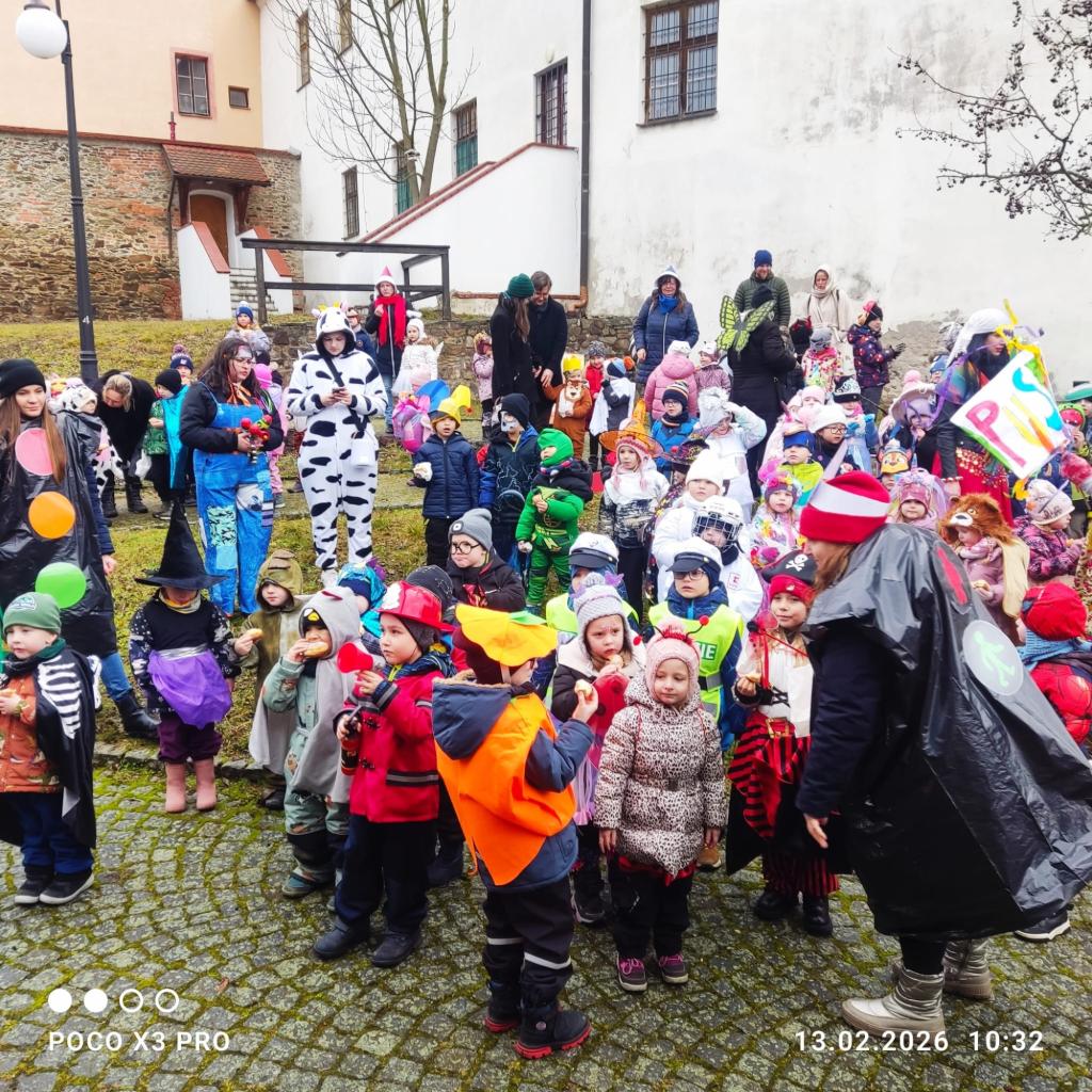 I přes deštivé ráno vyrazily v pátek 13. 2. 2026 již potřetí děti a učitelky z mateřských škol Zahradní, Michlova a Poděbradova do masopustního průvodu. Blížící se masopustní radovánky zavítaly díky nim i do Domažlic.