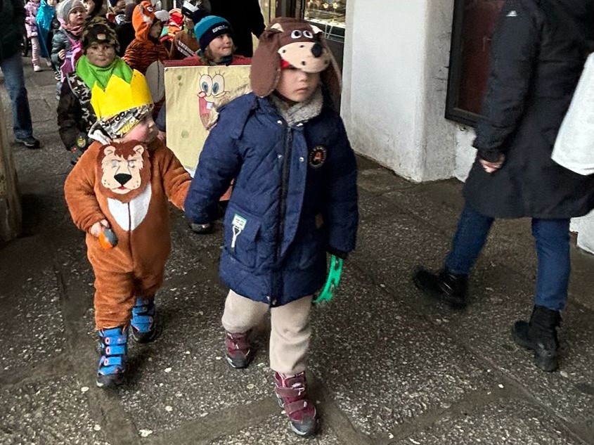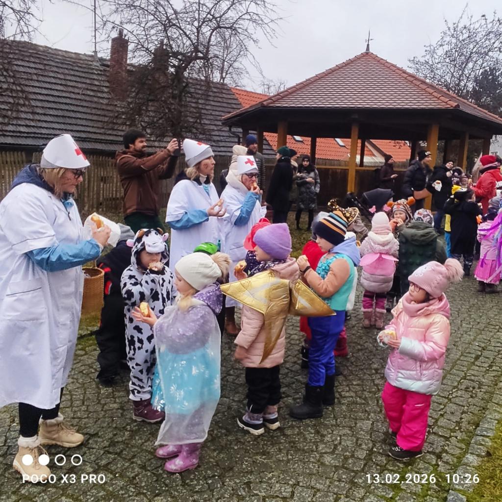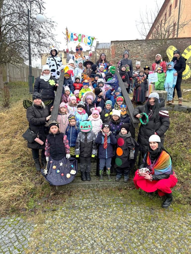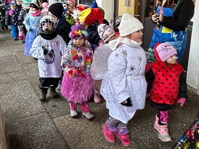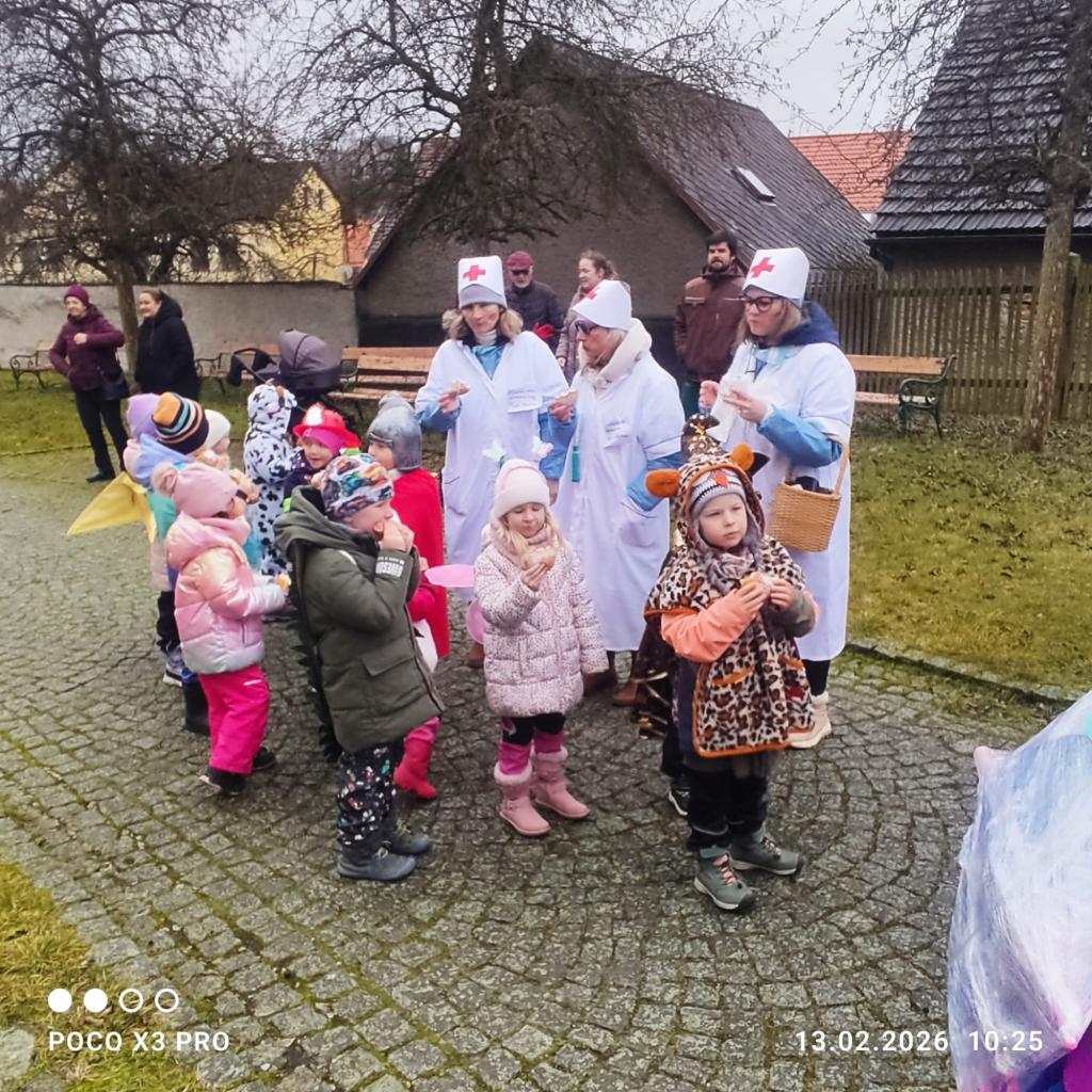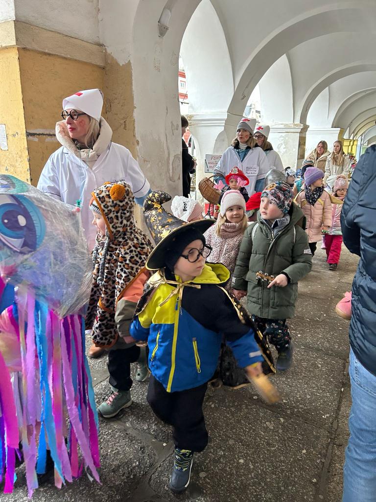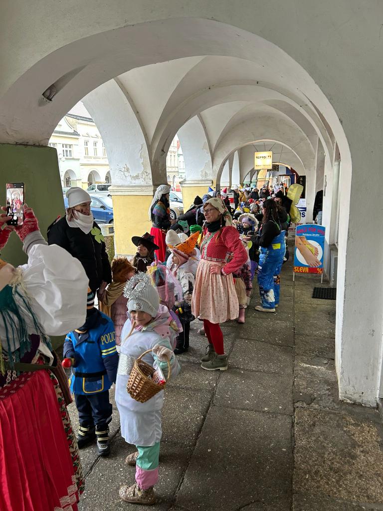 I přes deštivé ráno vyrazily v pátek 13. 2. 2026 již potřetí děti a učitelky z mateřských škol Zahradní, Michlova a Poděbradova do masopustního průvodu. Blížící se masopustní radovánky zavítaly díky nim i do Domažlic.