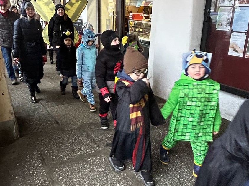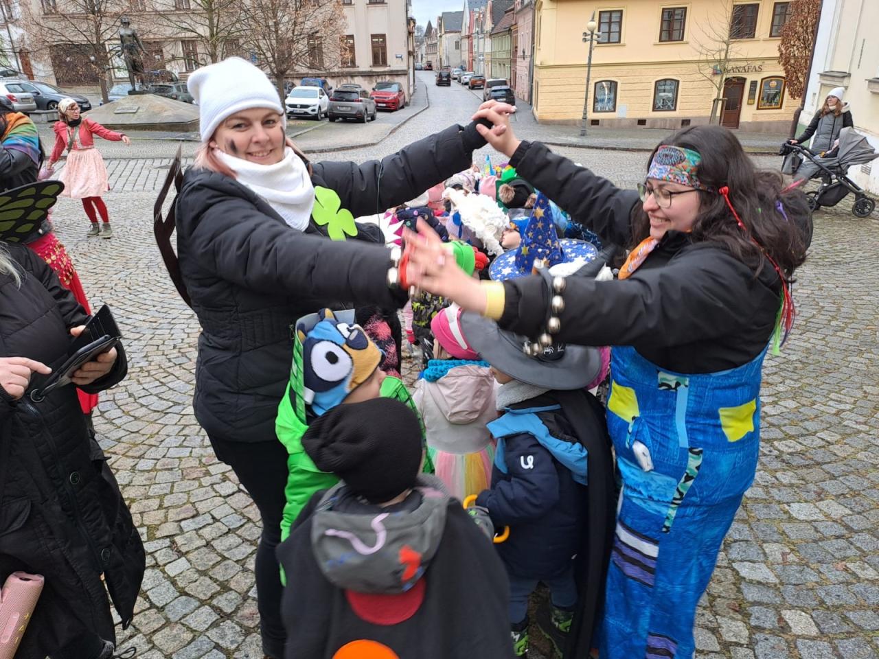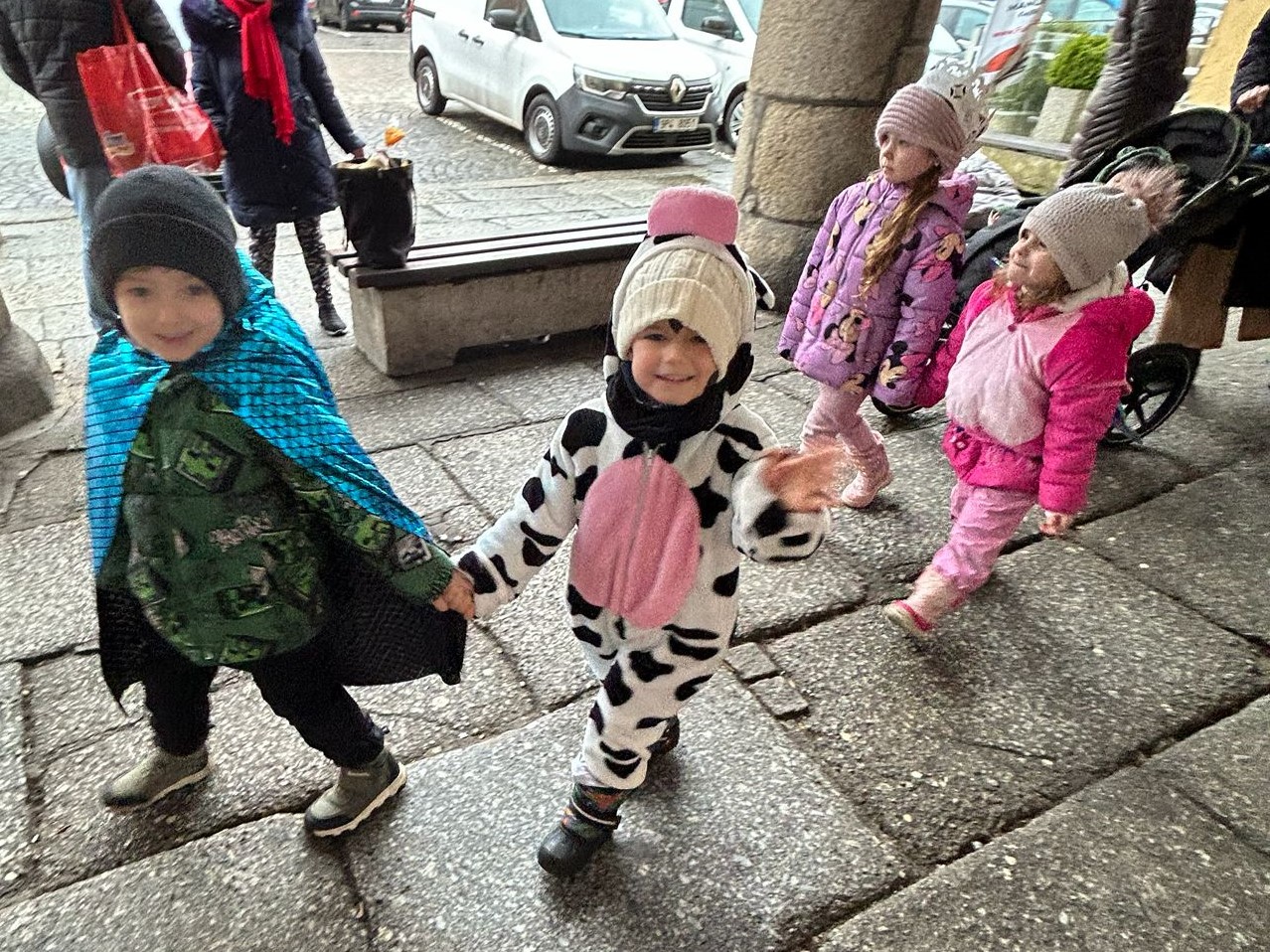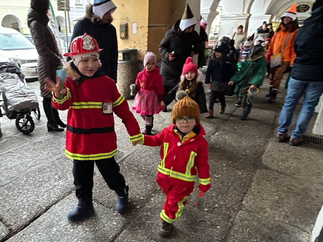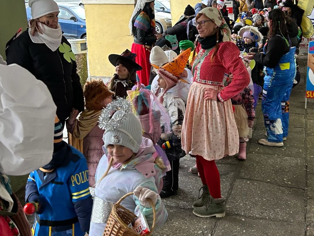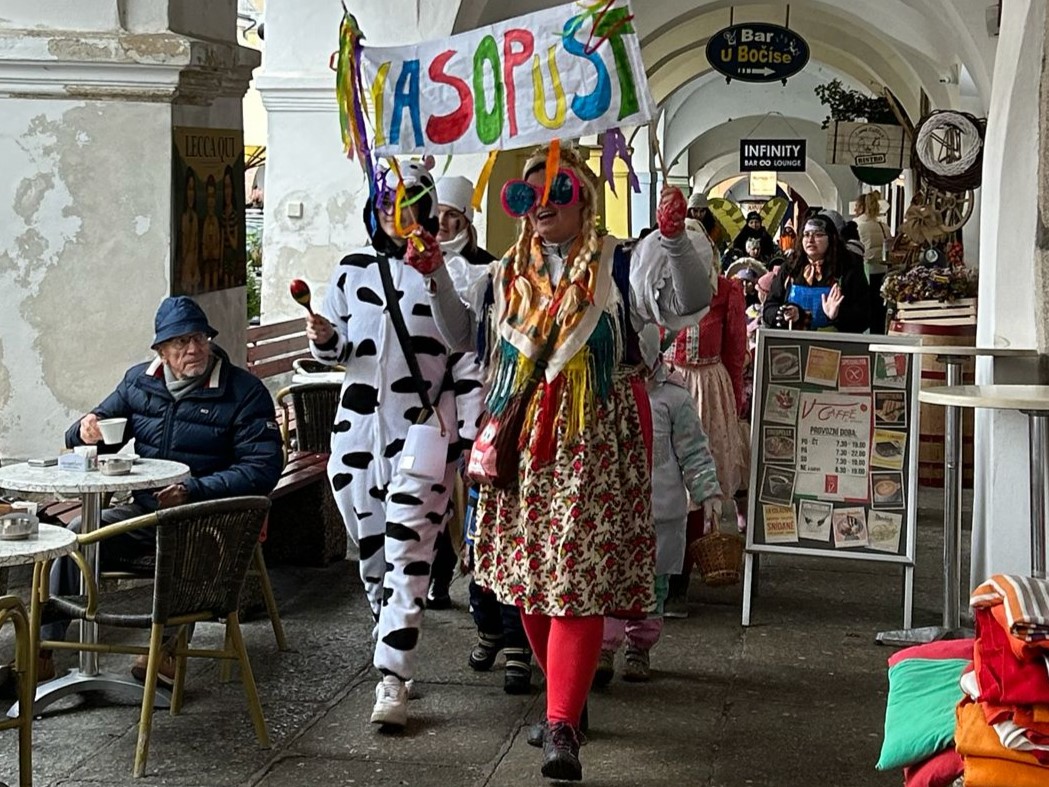 I přes deštivé ráno vyrazily v pátek 13. 2. 2026 již potřetí děti a učitelky z mateřských škol Zahradní, Michlova a Poděbradova do masopustního průvodu. Blížící se masopustní radovánky zavítaly díky nim i do Domažlic.