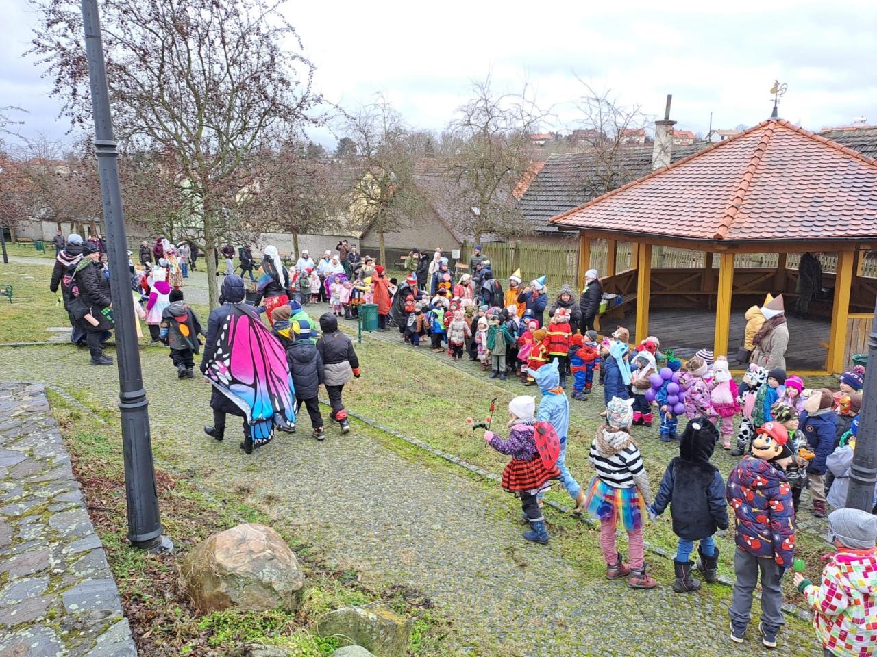 Dlouhý masopustní průvod plný různorodých masek vyrazil z Příhodova parku, dále prošel celým náměstím a byl ukončen na zahradě pod Chodským hradem. Po cestě se k průvodu připojili i někteří rodiče.