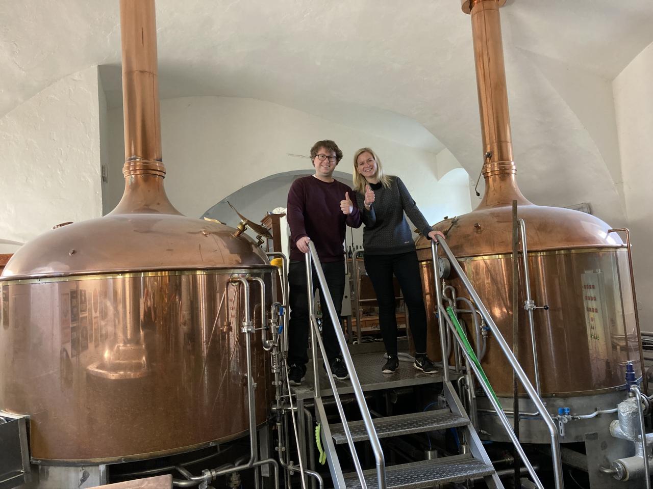 Sládek ing. David Bierhanzl a technoložka výroby ing. Jana Müllerová z Městského pivovaru Domažlice využili volné kapacity Břevnovského klášterního pivovaru sv. Vojtěcha.
