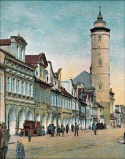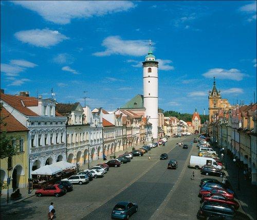 Domažlické obdélníkovitému náměstí (původně městské tržiště) vévodí 56 m vysoká nakloněná věž kruhového půdorysu patřící k arciděkanskému kostelu