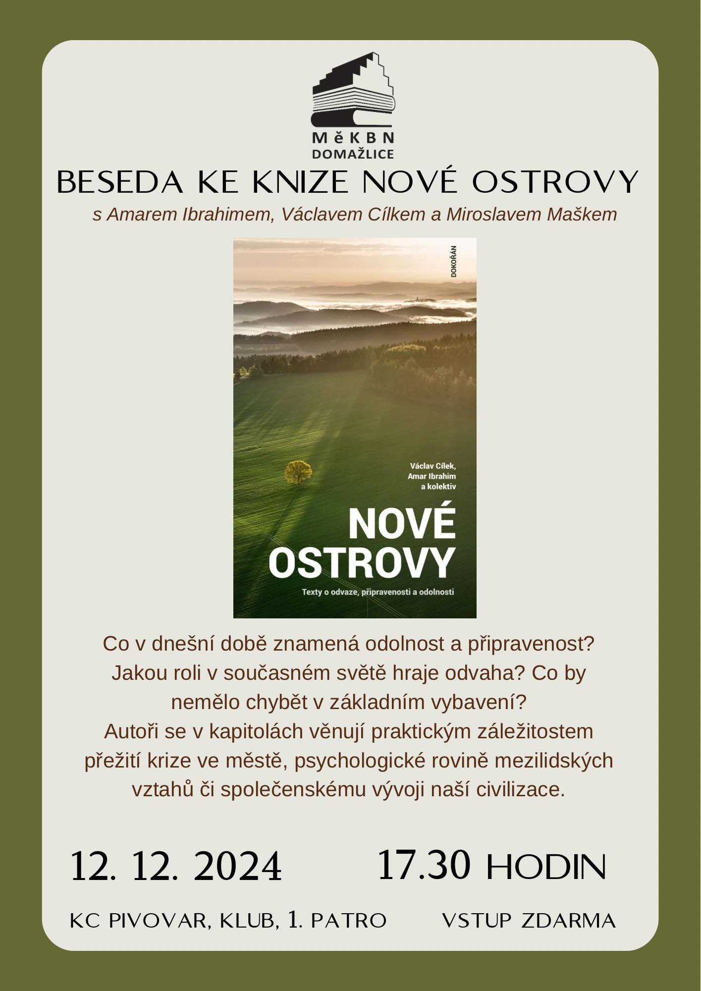 Amar Ibrahim, Václav Cílek a Miroslav Mašek se ve své knize Nové ostrovy věnují odolnosti, připravenosti, ale také odvaze. Přijďte s nimi podiskutovat na besedu, která proběhne ve čtvrtek 12. prosince 2024 v klubu Kulturního centra Pivovar Domažlice. Akce začíná v 17 hodin 30 minut, vstup je zdarma.
