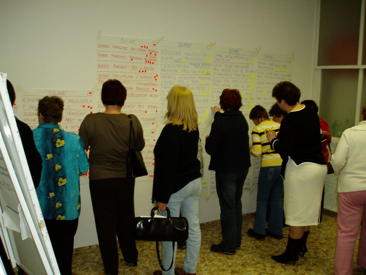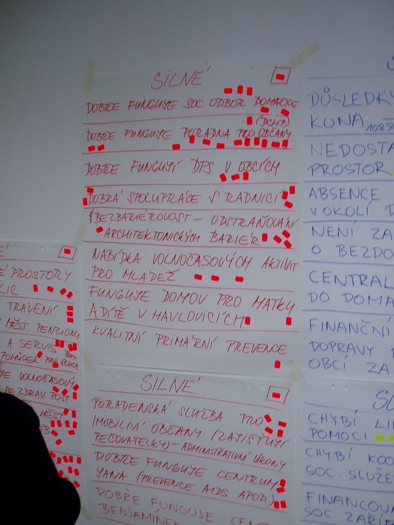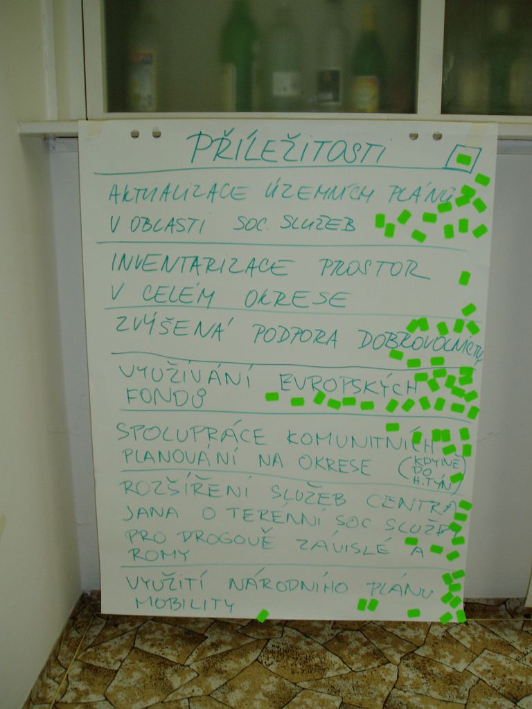 Vznikla tzv. SWOT analýza, jejímž smyslem je shrnutí vnitřních a vnějších faktorů ovlivňujících systém sociálních služeb. SWOT analýza je základní oporou strategické části plánování při formulaci cílů a opatření v komunitním plánu.Na setkání byla metoda SWOT analýzy krátce vysvětlena a pak byly sebrány jednotlivé náměty, které účastníci na závěr hodnotili přidělením bodů podle důležitosti výroků. Pro bodování měli účastníci k dispozici po 10 bodech pro silné a slabé stránky a po 5 bodech pro příležitosti a ohrožení.