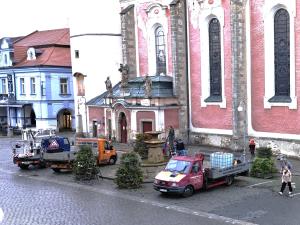 Pracovníci Domažlických technických služeb zazimovali kašnu na náměstí Míru. Bednění nad ní vydrží až do období příznivého jarního počasí.