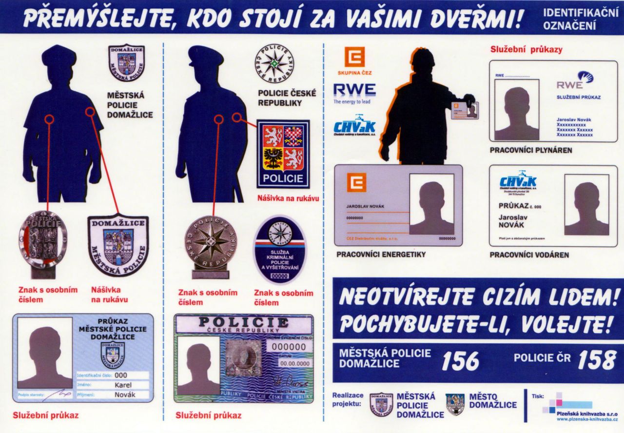 Zájemci o samolepící manuál z řad obyvatel Domažlic a Havlovic si jej mohou vyzvednout na služebně Městské policie Domažlice. Informace o podmínkách pro bezplatné osazení vstupních dveří panoramatickým kukátkem a bezpečnostním řetízkem sdělí na žádost právě preventista MP Domažlice na e-mailové adrese vaclav.kuban@mpdomazlice.cz.