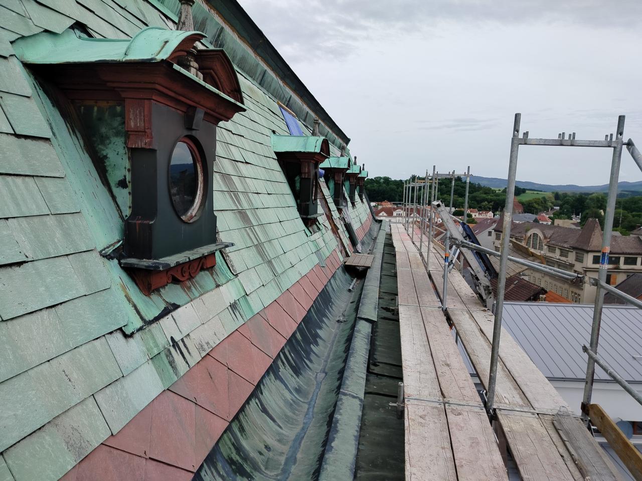 Snímek je z loňských oprav střechy v zadní části radnice.
