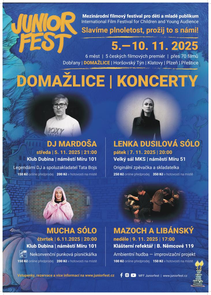 Na šest dní (5. -10. listopadu) se Domažlice stanou hostitelským městem mezinárodního festivalu filmů pro mladé publikum Juniorfest. ,,Program přinese celovečerní i krátké snímky z celého světa, premiéry českých filmů a poprvé také soutěžní sekci krátkometrážních děl,“ zmínila domažlická koordinátorka Juniorfestu Jana Jankovcová. Kromě mnoha projekcí bude připraven široký doprovodný program. Tahákem budou hlavně dva sólové koncerty - Nikoly Mucha 6. listopadu v Dubině a Lenky Dusilové 7. listopadu v MKS,“ doplnila Jankovcová.
