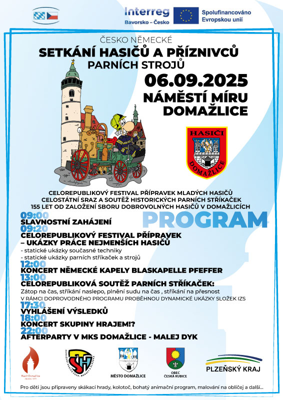 Uzavírka horní části náměstí Míru v Domažlicích od křižovatky náměstí Míru a ul. B. Němcové a ul. Chodská (u prodejny Albert) k čp. 1 (budova radnice) z důvodu konání akce Českoněmecké setkání hasičů a příznivců parních strojů potrvá od pátku 5. 9. 2025 17:00 do soboty 6. 9. 2025 24:00. Výjimku mají vozidla účinkujících, pořadatelů, prodejců občerstvení, města Domažlice a MKS v Domažlicích.