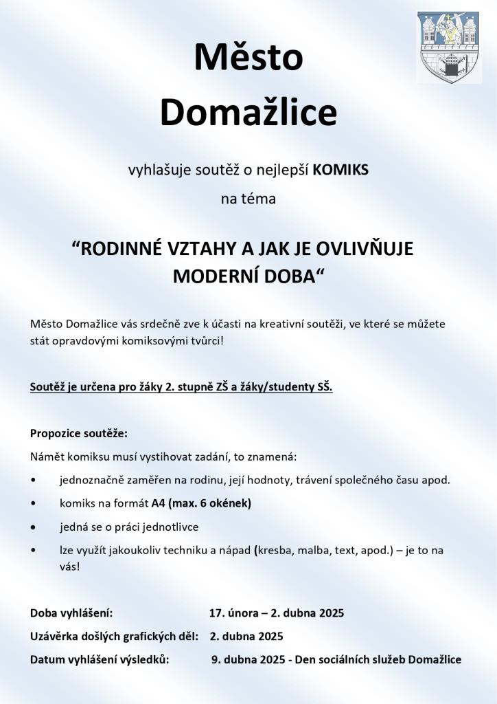 Město Domažlice vyhlašuje soutěž o nejlepší KOMIKS na téma RODINNÉ VZTAHY A JAK JE OVLIVŇUJE MODERNÍ DOBA.