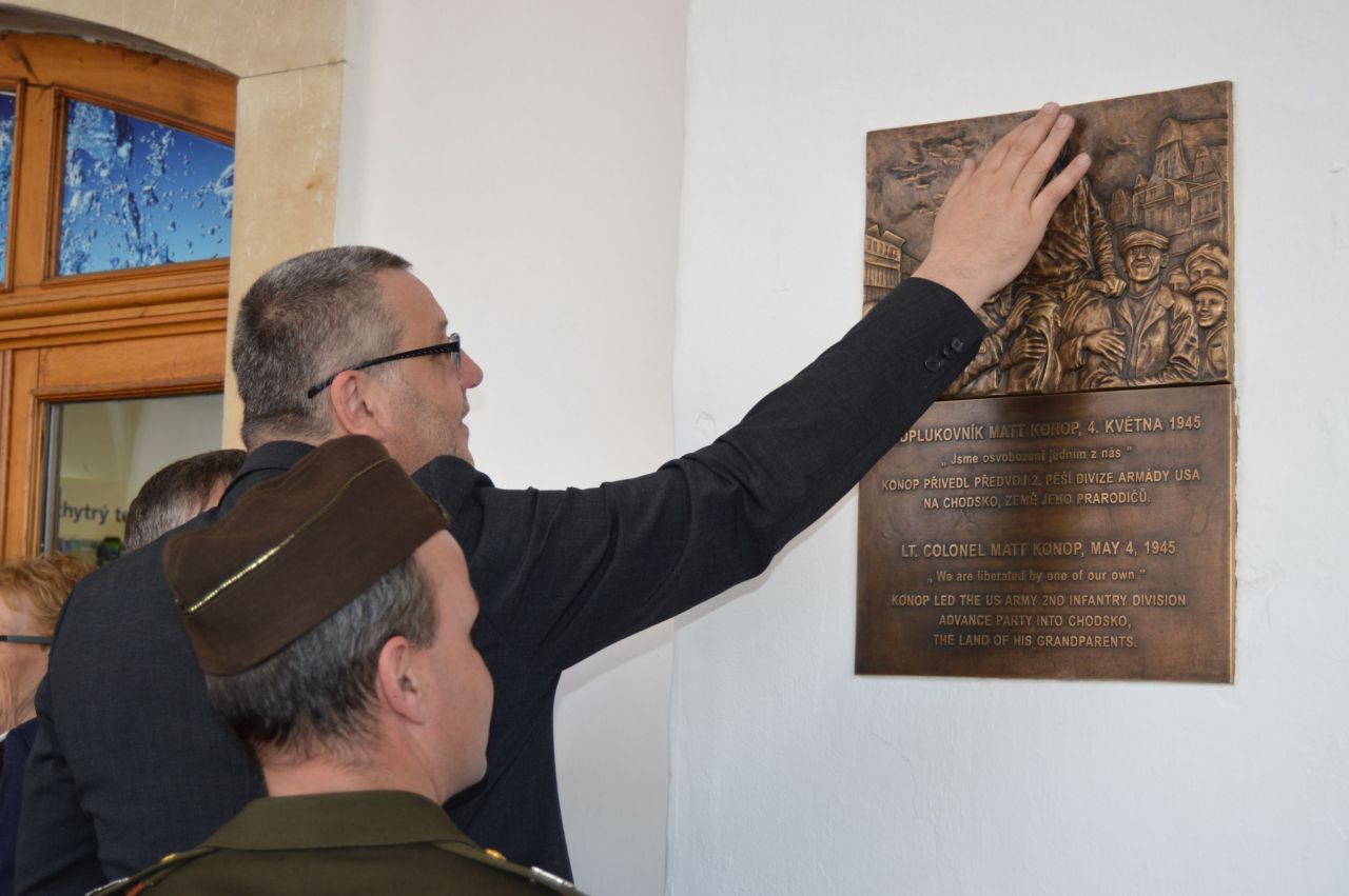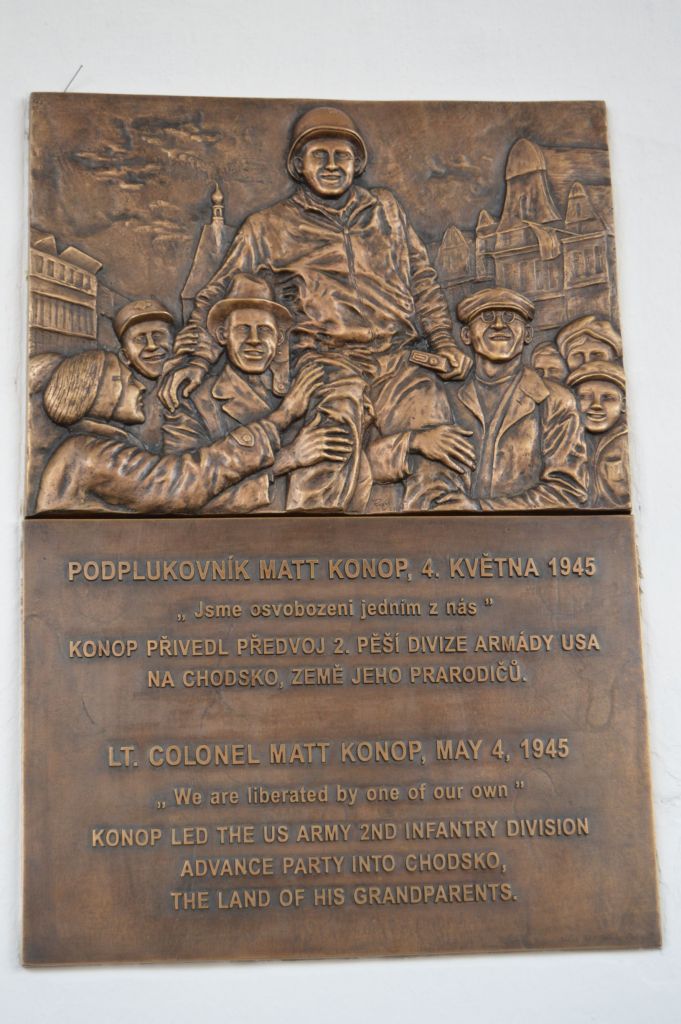 Po oficialitách na domažlickém náměstí byla u domu č. p. 58 odhalena pamětní deska pplk. Matta Konopa. Muže s českými kořeny, který při osvobozování Chodska v roce 1945 poznal, odkud pochází a v Domažlicích se stal hrdinou. U slavnostního odhalování nechyběli ani Konopovi vnuci Patrick a Jim Dewane a Konopova dcera Kay. Dotknutí se helmy Matta Konopa vyobrazeného na pamětní desce, jak ho lidé z Domažlic nesou na ramenou, prý nyní přináší štěstí.
