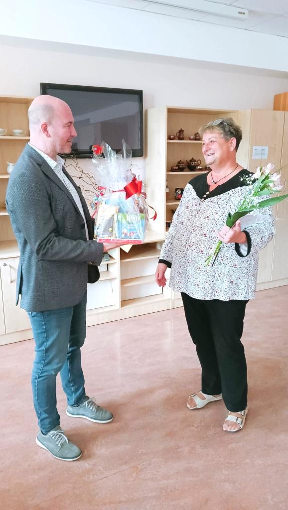 Malou pozornost zaměstnancům a poděkování za jejich práci jim předal místostarosta Domažlic Viktor Krutina (na prvním snímku s ředitelkou MCSRS Hanou Hruškovou).