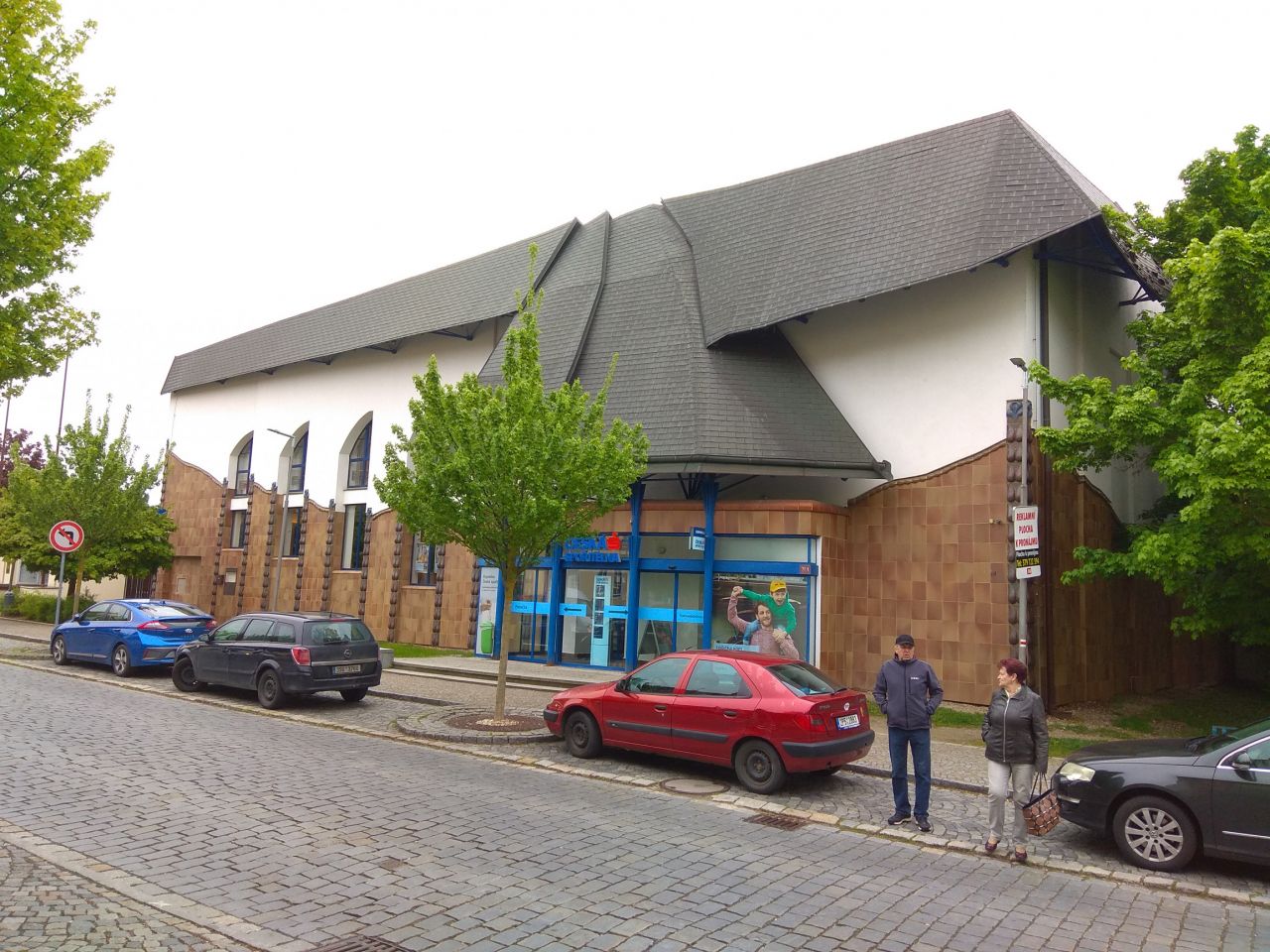 Zmíněný pozemek je vlevo od vchodu do budovy České spořitelny.