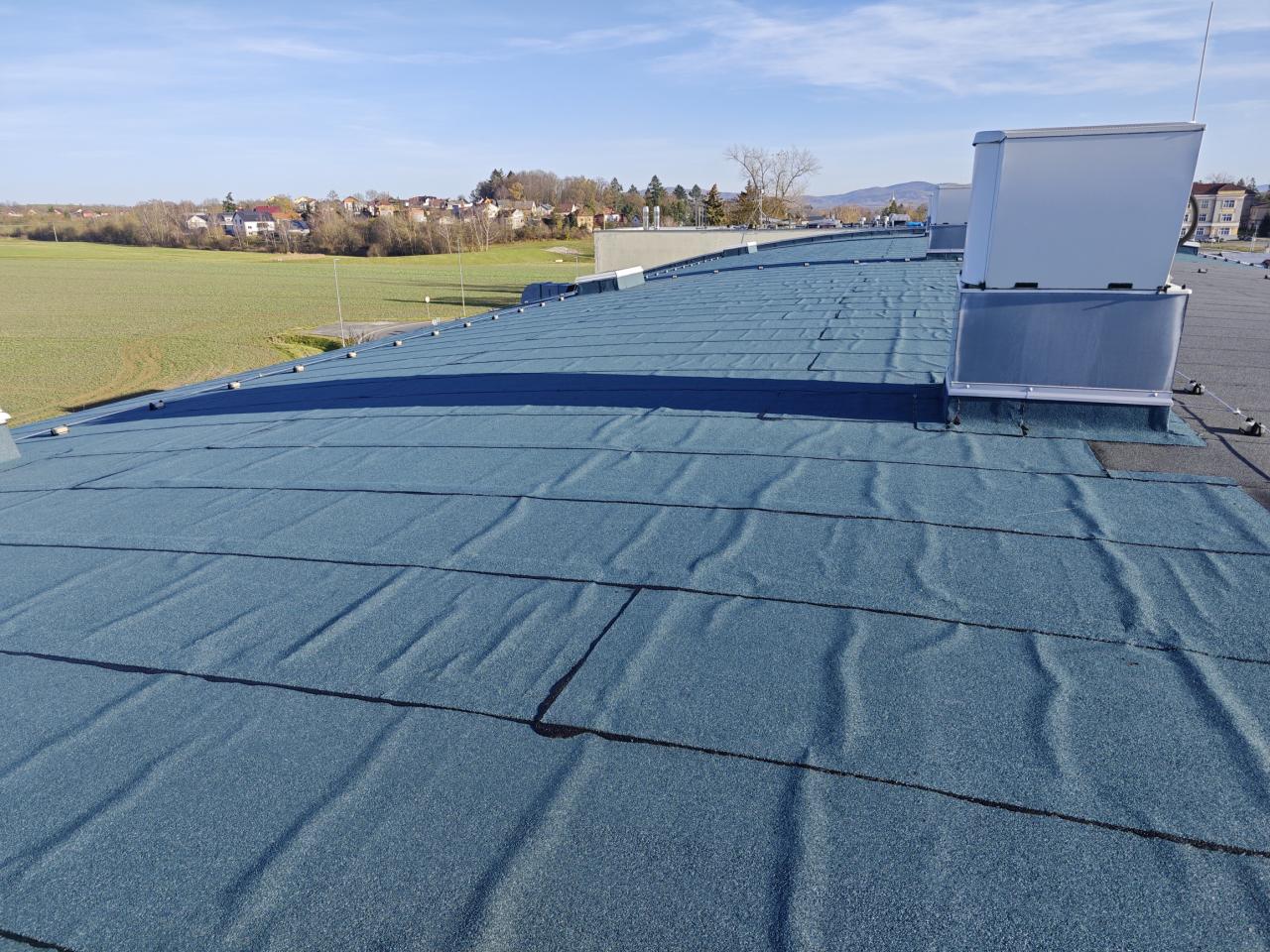 Stavbaři doplnili ze 2/3 novou střešní kritinu z modifikovaného asfaltového pásu protipožárního s odolností vůči UV záření. Součástí prací bylo i doplnění a vyspádování podkladního izolačního materiálu na rovných střechách.